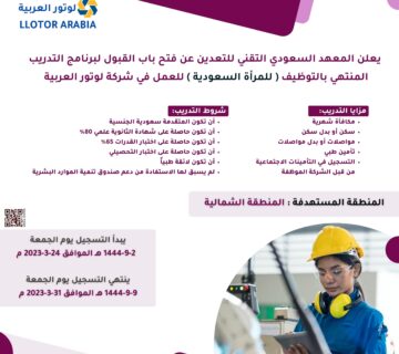 يعلن #المعهد_السعودي_التقني_للتعدين⁩ عن فتح باب القبول لبرنامج التدريب المنتهي بالتوظيف ( للمرأة السعودية ) للعمل في شركة لوتور العربية يبدأ التسجيل في ٢٤مارس ٢٠٢٣ م ... اقرأ أكثر